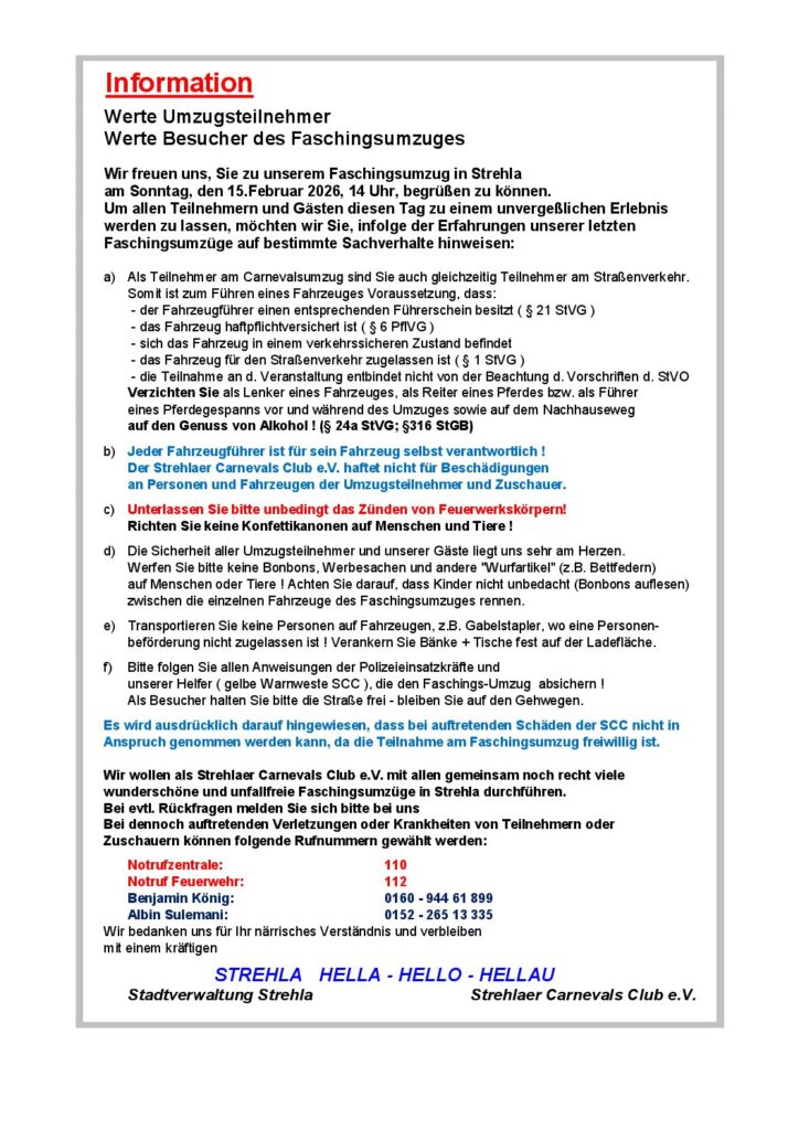 Alle wichtigen Informationen zum diesjährigen Faschingsumzug 2026 in Strehla!